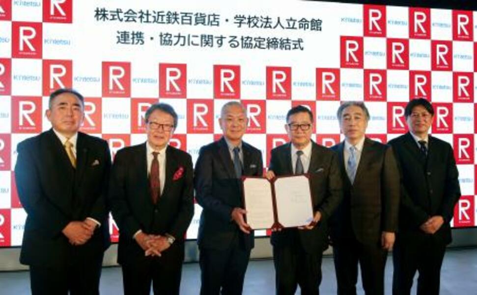 連携協定の締結式に臨んだ近鉄百貨店の秋田拓士会長(左から2人目)と学校法人立命館の森島朋三理事長(右から3人目)ら=3日、大阪府茨木市