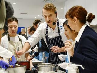ウクライナ料理を作るエウヘン・クロポテンコさん(左から2人目)と参加者ら=21日、東京都千代田区
