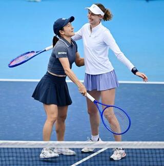ダブルスで準々決勝進出を決めた青山修子(左)、クリスティナ・ブクサ組=有明テニスの森公園