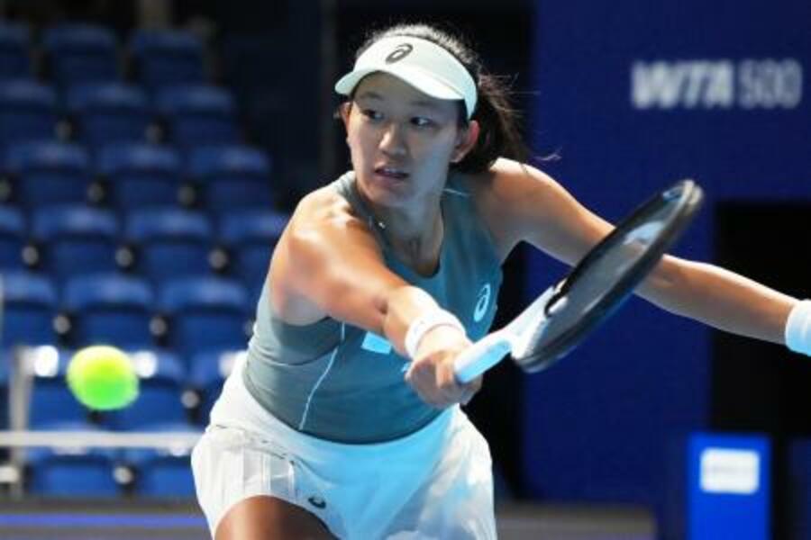東レ・パンパシフィック・オープン、1回戦でソフィア・ケニンと対戦する内島萌夏=21日、東京・有明テニスの森公園(ゲッティ=共同)