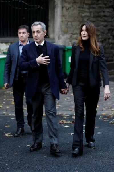 刑務所への収監のため自宅を出るフランスのサルコジ元大統領=21日、パリ(ロイター=共同)