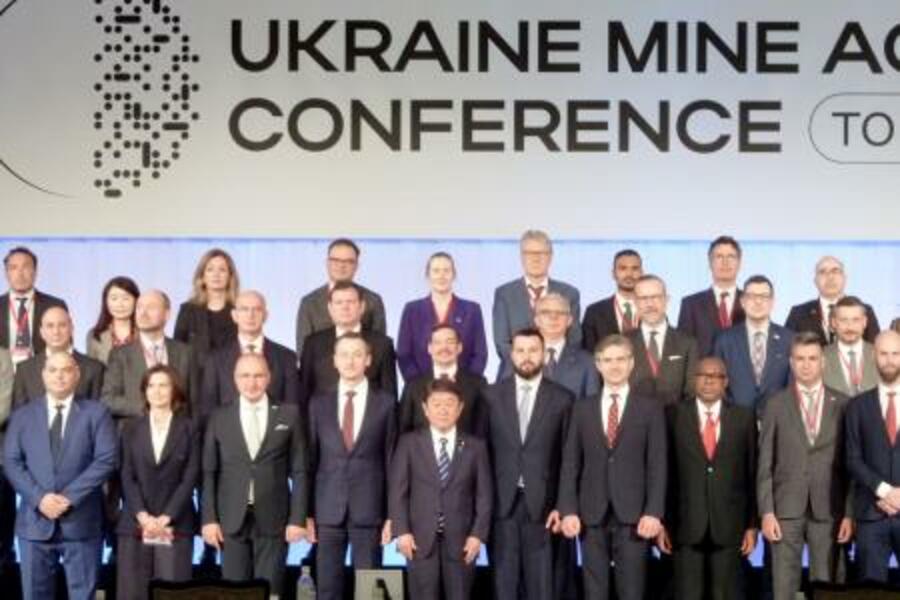 ウクライナの地雷対策を協議する国際会議で記念写真に納まる出席者ら。前列左から5人目は茂木外相=22日午前、東京都内