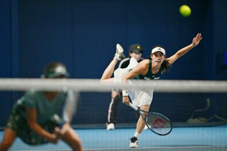 ダブルス1回戦でプレーする加藤未唯(右)、二宮真琴組=有明テニスの森公園