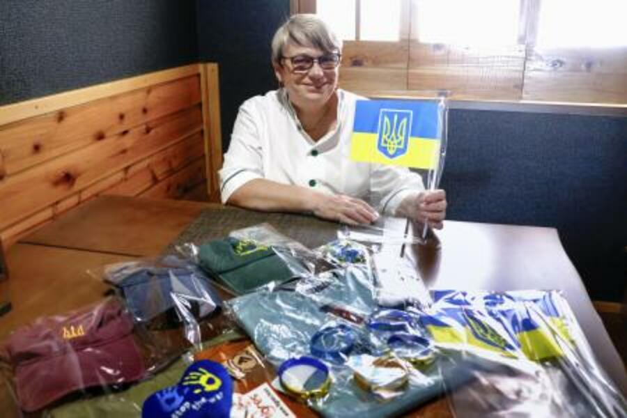 「キッチンウクライナ」の来店客に記念品を贈呈するサービスを始めたクービック・ナタリヤさん=17日、群馬県桐生市