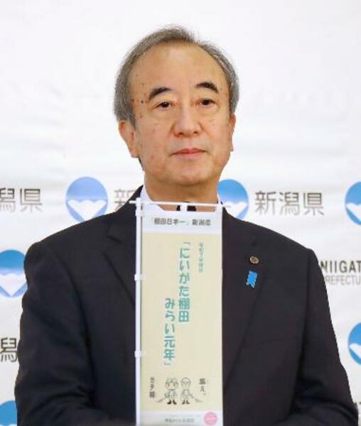 定例の記者会見を行う新潟県の花角英世知事=23日午前、県庁