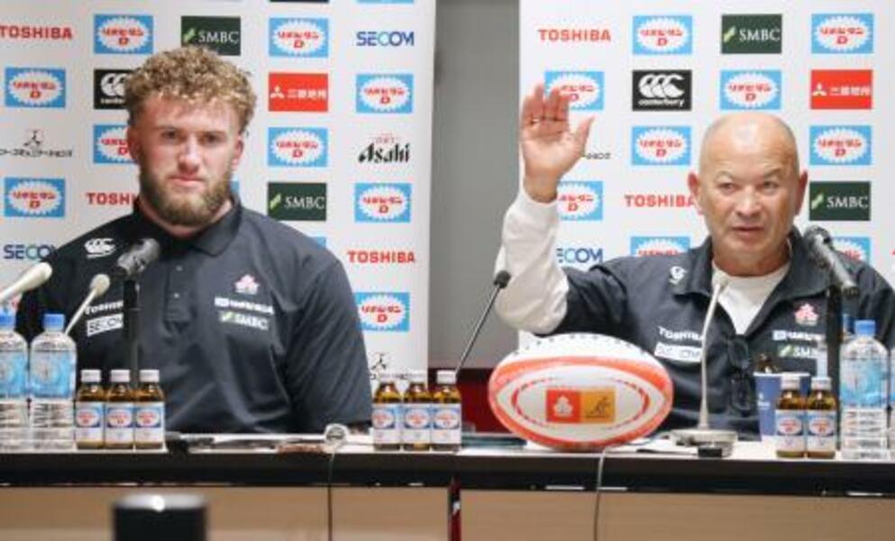 記者会見するラグビー日本代表のジョーンズHC(右)とディアンズ=23日、東京都内
