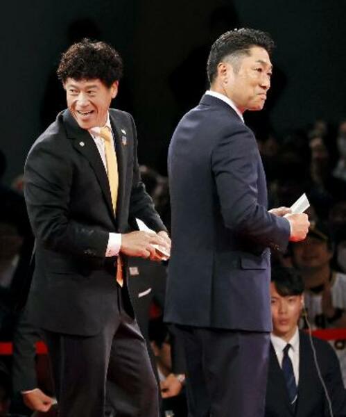米スタンフォード大・佐々木麟太郎内野手の指名で競合し、交渉権を獲得したソフトバンク・城島CBO(左)と敗れたDeNA・相川監督=23日午後、東京都内のホテル