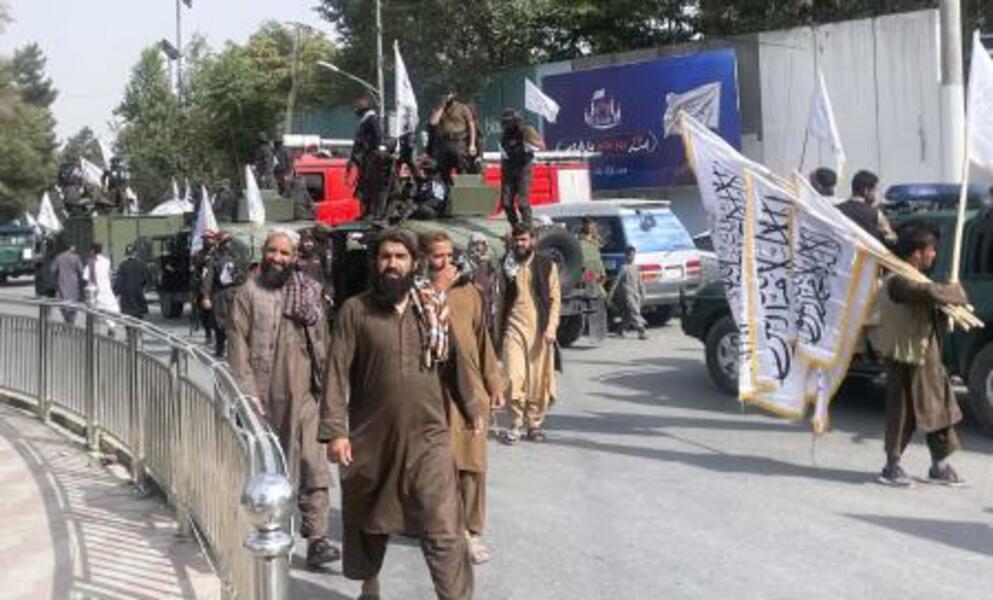 8月、アフガニスタンの首都カブールで、タリバンの旗を掲げて復権4年を誇示する治安部隊員や支持者ら(共同)