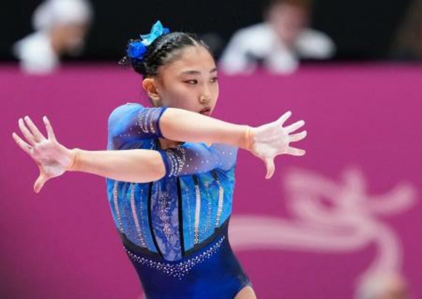 女子個人総合決勝 岸里奈の床運動=ジャカルタ(共同)