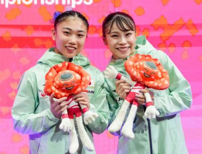 女子個人総合で6位の岸里奈(左)と7位の杉原愛子=ジャカルタ(共同)