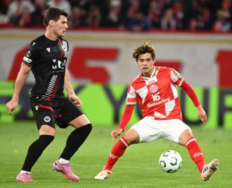 ズリニスキ戦でプレーするマインツの佐野(右)=マインツ(共同)