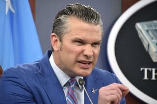 米国防総省で記者会見するヘグセス国防長官=6月、ワシントン近郊