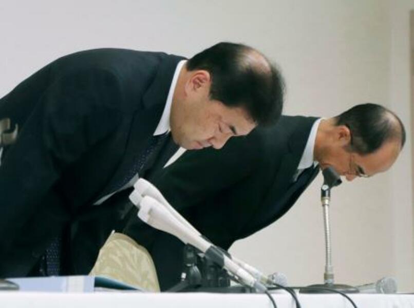 記者会見で謝罪するかんでんエンジニアリングの大久保昌利社長(手前)ら=24日午後、大阪市北区