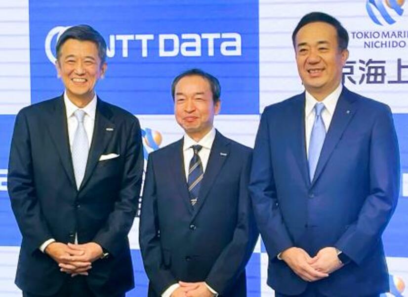 記者会見で撮影に応じる、「NTTデータライフデザイン」の浜口雅史社長(中央)ら=24日午前、東京都千代田区