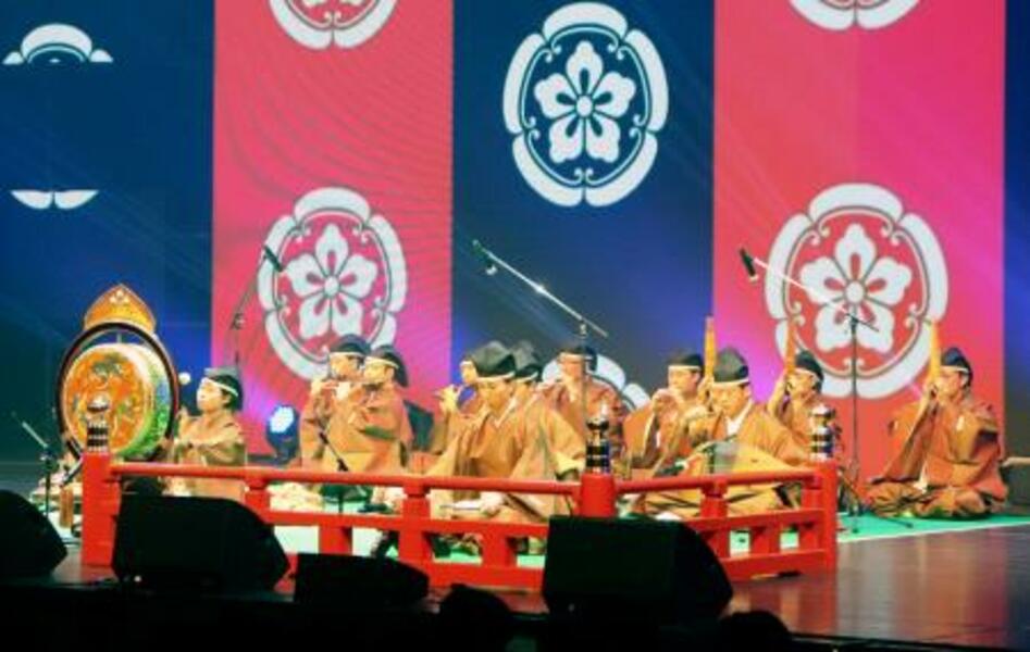 韓国・忠清南道との音楽交流イベントで披露された雅楽=24日午後、奈良市