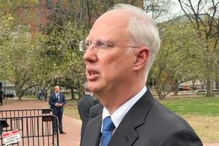 4月、ワシントンで記者団の質問に答えるドミトリエフ氏(タス=共同)