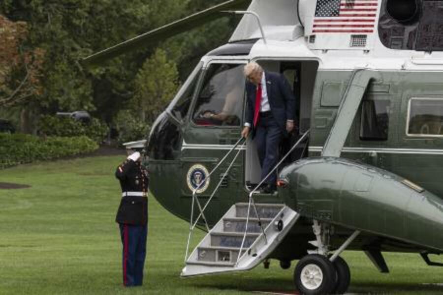 米大統領専用ヘリ、マリーンワンから降りるトランプ大統領=9月、ホワイトハウス南庭(ゲッティ=共同)