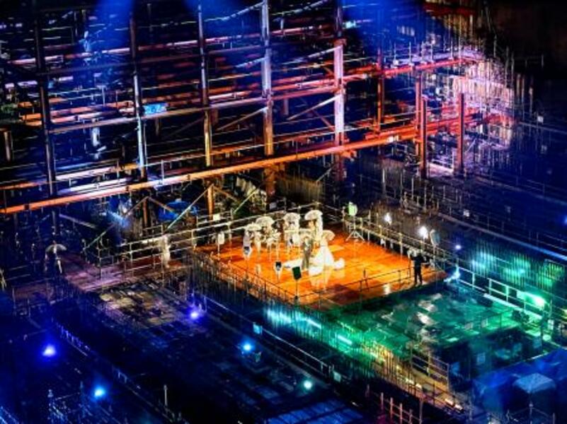 リニア中央新幹線神奈川県駅(仮称)の工事現場に設けられ、ライトアップされたステージ=25日午後、相模原市