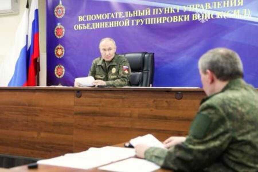 ロシア大統領府が26日に公開したゲラシモフ参謀総長(手前)とプーチン大統領が参加した会合(ロシア大統領府提供・タス=共同)