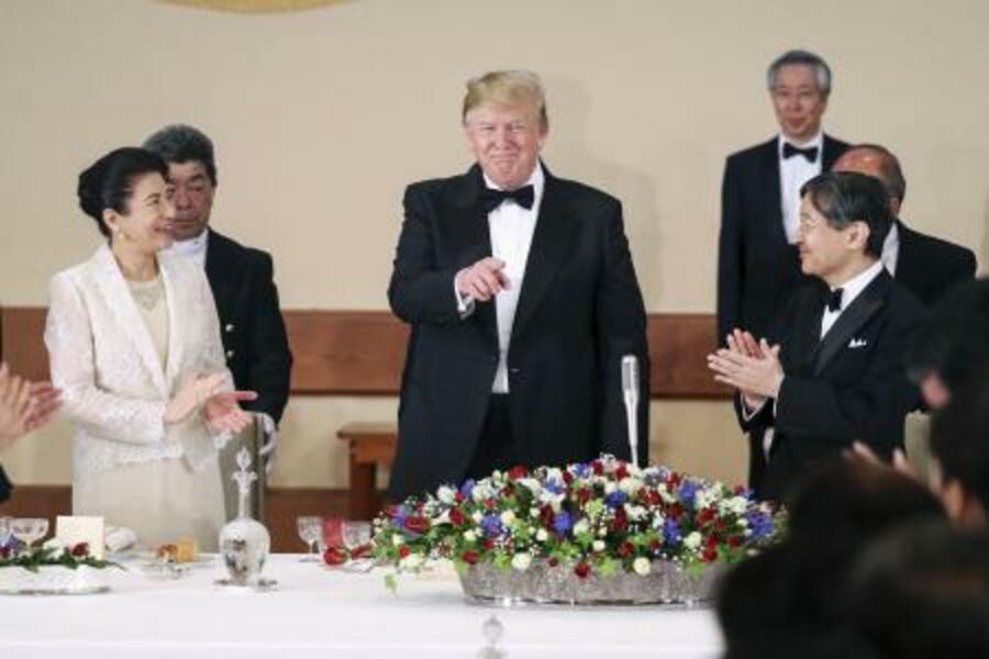 2019年5月、宮中晩さん会で乾杯を終え、笑顔を見せるトランプ米大統領と拍手を送られる天皇、皇后両陛下=宮殿・豊明殿
