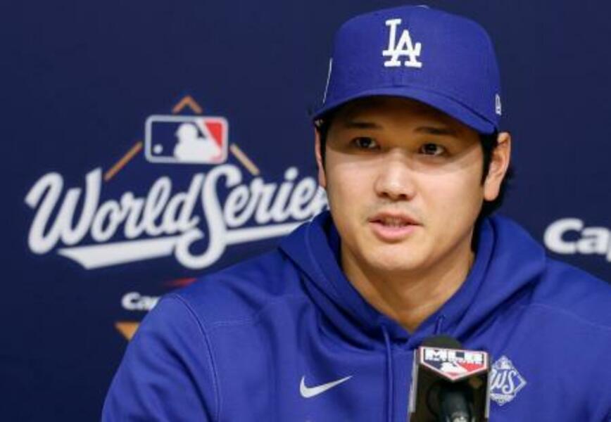 記者会見するドジャース・大谷=ロサンゼルス(共同)