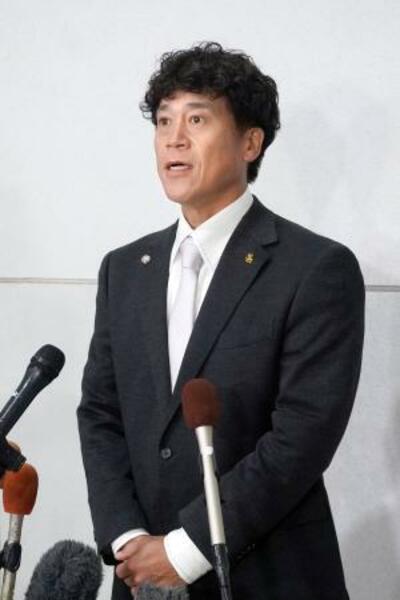 花巻東高を訪問後、報道陣の取材に応じるソフトバンク・城島CBO=28日、岩手県花巻市