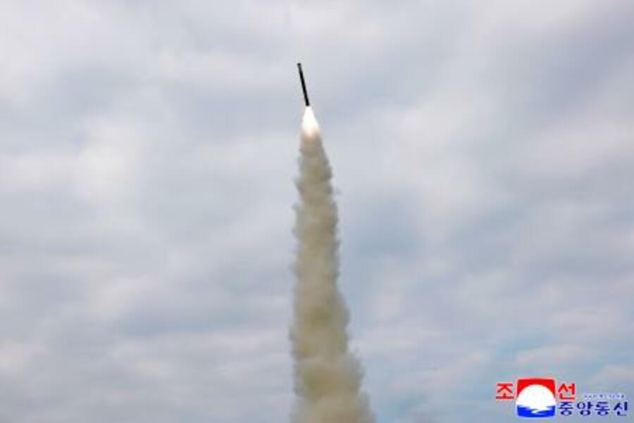 北朝鮮のミサイル総局が黄海で行った巡航ミサイルの試射=28日(朝鮮中央通信=共同)
