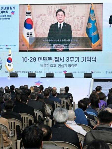 梨泰院雑踏事故から29日で3年となり、ソウル中心部の光化門広場で開かれた追悼式に映像メッセージを寄せた李在明大統領(共同)
