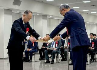 大阪国税局で開かれた「清酒鑑評会」の表彰式で、表彰状を受け取る白鶴酒造の関係者(左)=30日午前、大阪市中央区
