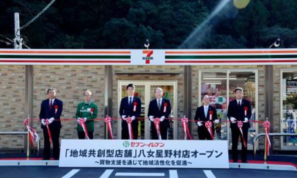 セブン―イレブン初の「地域共創型店舗」の開店を祝う関係者ら=福岡県八女市