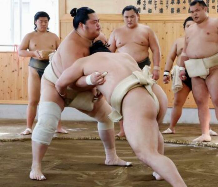 本格的に稽古を再開した琴桜(左)=福岡市東区の佐渡ケ嶽部屋