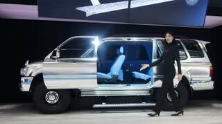アイシンが披露した、左右に開く大開口の電動スライドドア=30日午後、東京都江東区の東京ビッグサイト