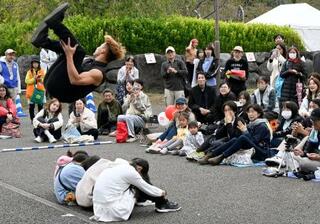 「大道芸ワールドカップin静岡2025」で、座った子どもたちの上を宙返りで飛び越えるアーティスト=31日午後、静岡市