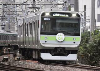 環状運転100周年記念のヘッドマークを付け走行するJR山手線のラッピング列車=10月、東京都渋谷区