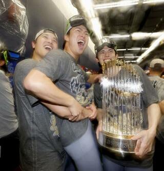 米大リーグ、ワールドシリーズ2連覇を達成し、シャンパンファイトで盛り上がるドジャースの(左から)大谷翔平、山本由伸、トロフィーを持つ佐々木朗希=2日、トロント(共同)