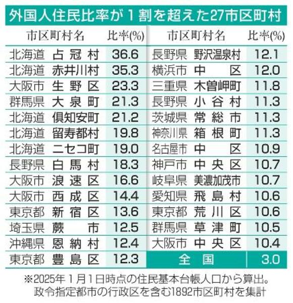 外国人1割超、27市区町村に