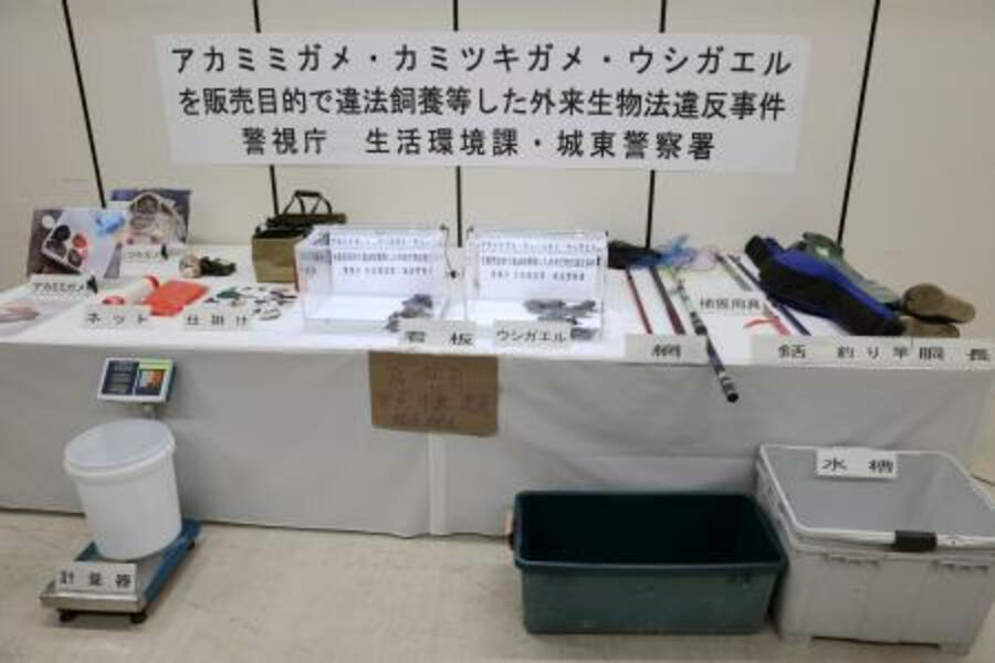 押収された捕獲道具やウシガエルなど=4日午前、警視庁城東署