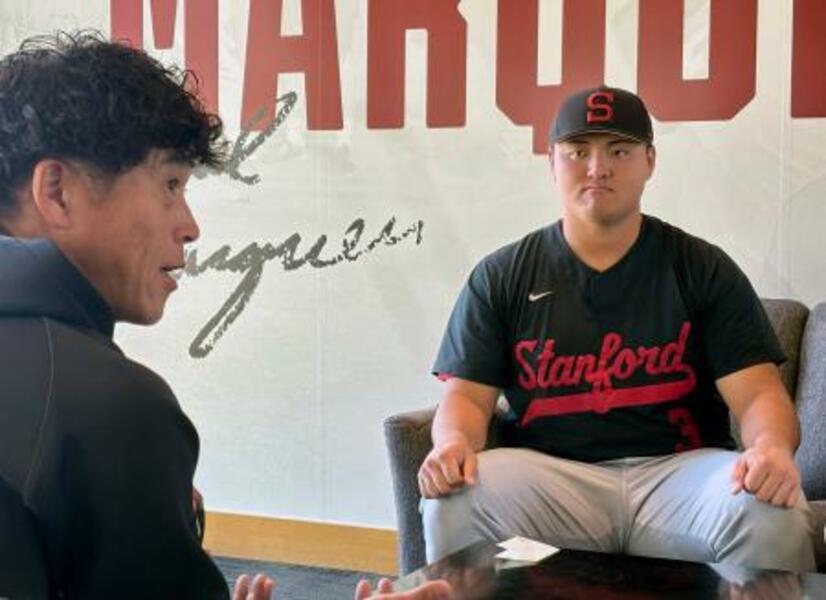 ソフトバンクの城島CBO(左)から指名あいさつを受けるスタンフォード大の佐々木麟太郎=4日、米カリフォルニア州スタンフォード(ソフトバンク球団提供・共同)