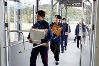 石川県輪島市の県立門前高で、完成した仮設校舎に勉強机や椅子を運び込む生徒たち=5日午前