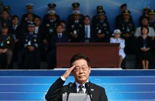 「国軍の日」の式典で敬礼する韓国の李在明大統領=10月1日、韓国中部忠清南道(聯合=共同)