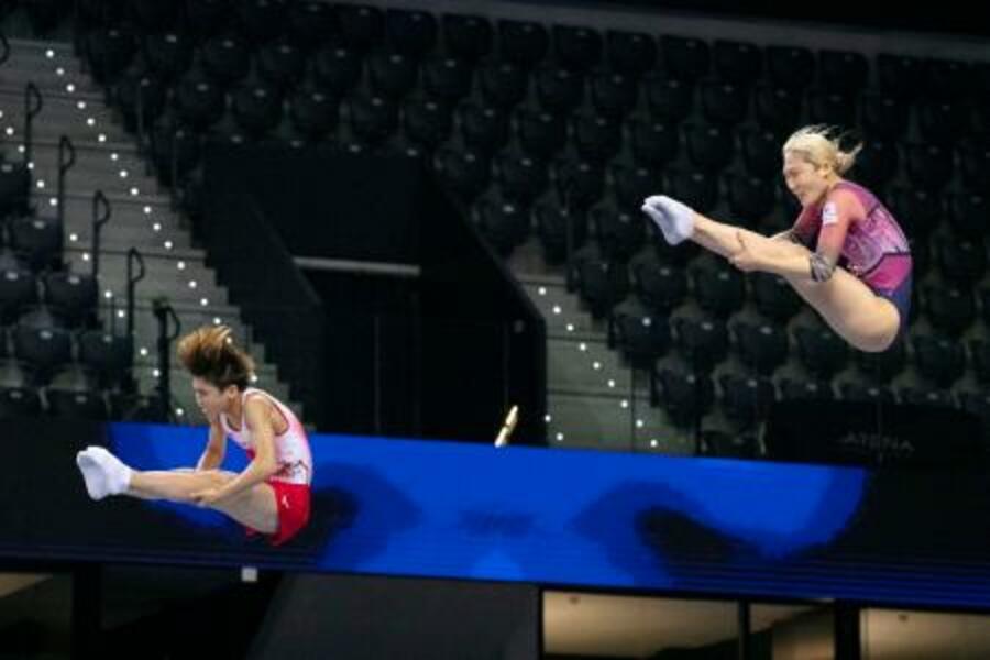 シンクロナイズド混合予選に臨んだ松本悠生(左)、森ひかる組=パンプロナ(共同)