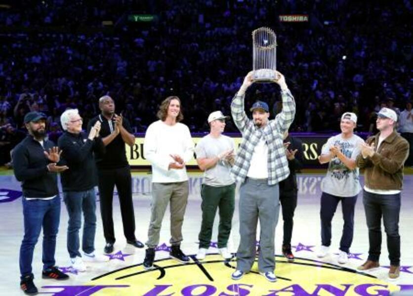 レーカーズ戦のコートに登場し、優勝トロフィーを掲げるドジャースのスネル=5日、ロサンゼルス(ゲッティ=共同)
