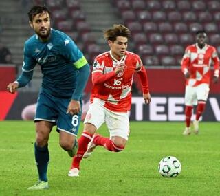 フィオレンティナ戦で攻め込むマインツの佐野(右)=マインツ(共同)