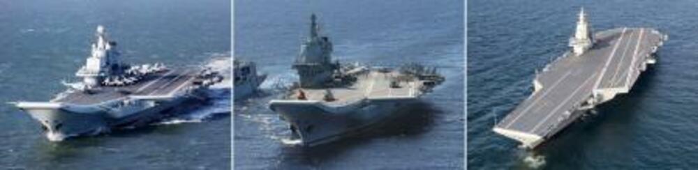 「遼寧」(左)、「山東」(中央)に「福建」が加わり、3隻体制を確立した中国軍の空母(左はCNS=共同、中央と右は新華社=共同)