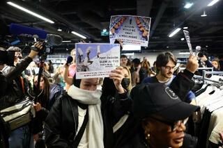 5日、パリの老舗デパートに「SHEIN(シーイン)」の店舗がオープンしたことに抗議する人々(ロイター=共同)