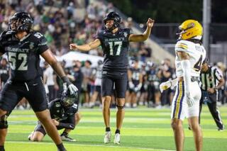 カリフォルニア大と対戦したハワイボウルでFGを決めたハワイ大の松沢寛政(中央)=ホノルル(ゲッティ=共同)