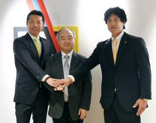 ソフトバンクの孫正義オーナー(中央)とポーズをとる小久保監督(左)と城島CBO=25日、東京都港区