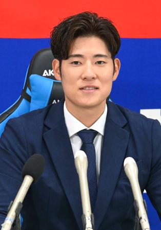 契約を更改し、記者会見する中日・上林=25日、ナゴヤ球場
