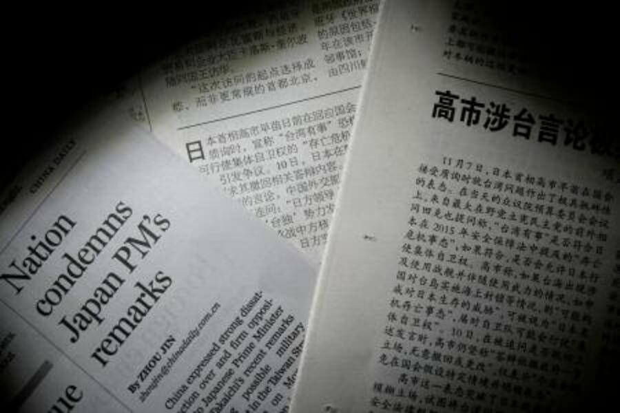 高市首相の台湾を巡る発言について報じる11日付の国営英字紙チャイナ・デーリー(左)と共産党機関紙、人民日報系の環球時報(共同)