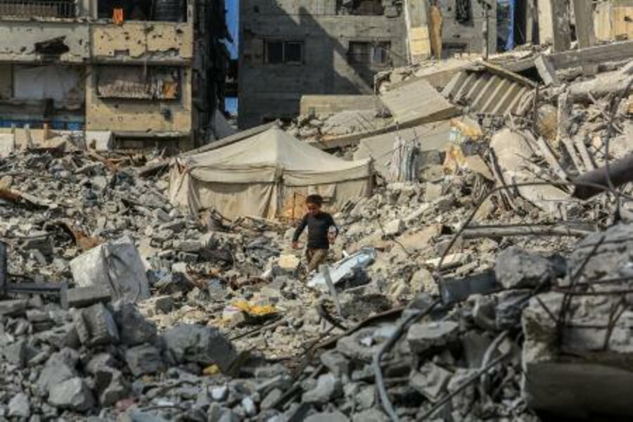 激しく破壊されたガザ南部ハンユニスの建物=11日(ゲッティ=共同)